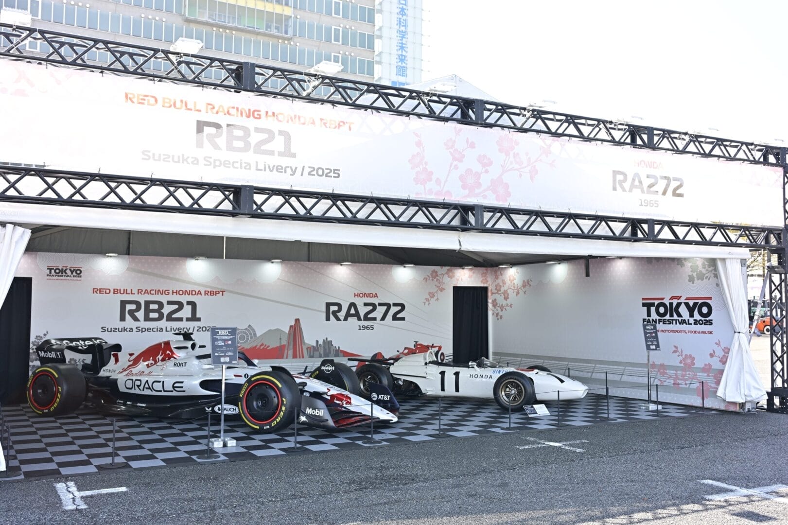 F1の世界を身近に体験できるゾーンでは、1965年にHondaがF1初優勝を果たした伝説のマシン「Honda RA272」をはじめ、2006年のハンガリーGPで劇的な勝利を収めた「Honda RA106」、2021年にマックス・フェルスタッペンが自身初のドライバーズチャンピオンに輝いた「Red Bull Racing Honda RB16B」など歴代F1マシンを特別展示。